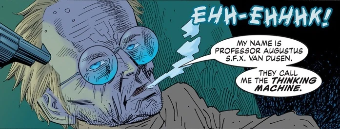 After his death, it was discovered by the inhabitants of Lincoln Island that Van Dusen had left behind hundreds of thousands of mysterious punch cards. It wasn't until the 1990s that technology had advanced sufficiently to upload these punch cards into a single mainframe - this was done by Jack Dakkar and the cards turned out to collectively contain an artificial copy of Van Dusen's own consciousness. Thus he became a literal 'Thinking Machine' and the primary source of intel for Lincoln Island under the rule of Jack Dakkar.